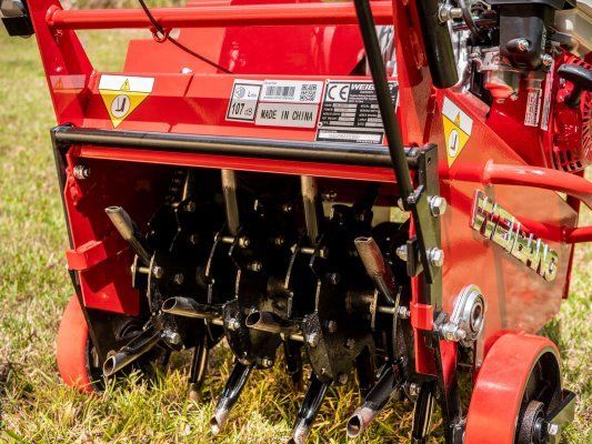 Dieser Aerifizierer von der Firma Weibang ist mit einem Loncin Motor ausgestattet. Die spezialgehärteten Hohlzinken dringen dank der 170 kg Eigengewicht der Maschine mühelos bis zu 70 mm in den Boden ein und heben einen kreisrunden Zapfen aus, ohne den Boden herum unnötig zu verhärten. Die entstehenden Löcher können mit Sand verfüllt werden. Somit ist die Durchlässigkeit des Bodens wieder gegeben und einem schönem Rasen steht nichts mehr im Wege.