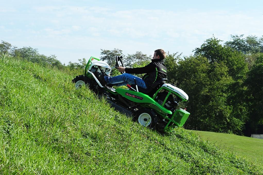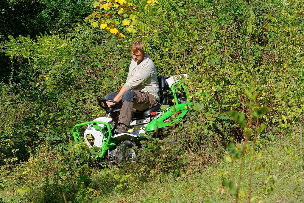 Weit vorn! Der Aufsitzgestrüppmäher Attila 98X von ETESIA ist robust, effizient, komfortabel und sicher. Beweglichkeit, Leistung und sein Vierradantrieb machen ihn zu einer Referenz unter Grünflächenprofis.