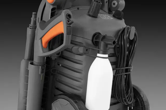 Der praktische Stauraum an Bord sorgt dafür, dass Sie alles, was Sie brauchen, in Reichweite haben. Der PW 360 ist mit verschiedenen Zubehörteilen kompatibel, und um die optimale Einstellung für jede Aufgabe zu finden, sind Düsen- und Druckführungen am Gerät vorhanden. Nach getaner Arbeit lässt sich der Schlauch mit Hilfe der Schlauchtrommel mit Stützführung schnell aufrollen, so dass der Schlauch effizient aufbewahrt werden kann. Der Hochdruckreiniger verfügt außerdem über große Räder mit weichem Profil für eine gute Traktion in schwierigem Gelände, eine Abzugspistole mit geringem Kraftaufwand und einen klappbaren Aluminiumgriff, um den Platzbedarf für die Lagerung zu verringern.